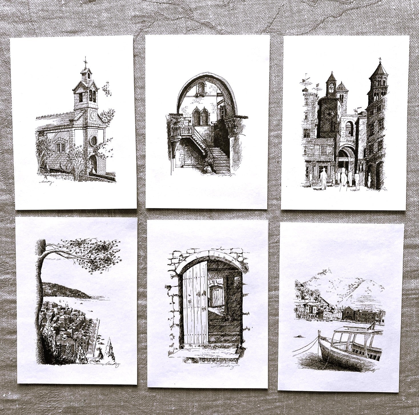 This set of 6 blank note cards illustrated by Architectural Artist Mindy Mullan were part of the cultural study of the villages and towns along the Dalmatian Coast of Croatia she undertook in 1990's.